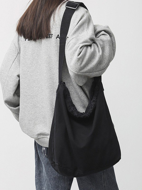 Details : Es hat einen ausgefransten Saum, einen verstellbaren Schultergurt, Innentaschen und einen Metallreißverschluss.